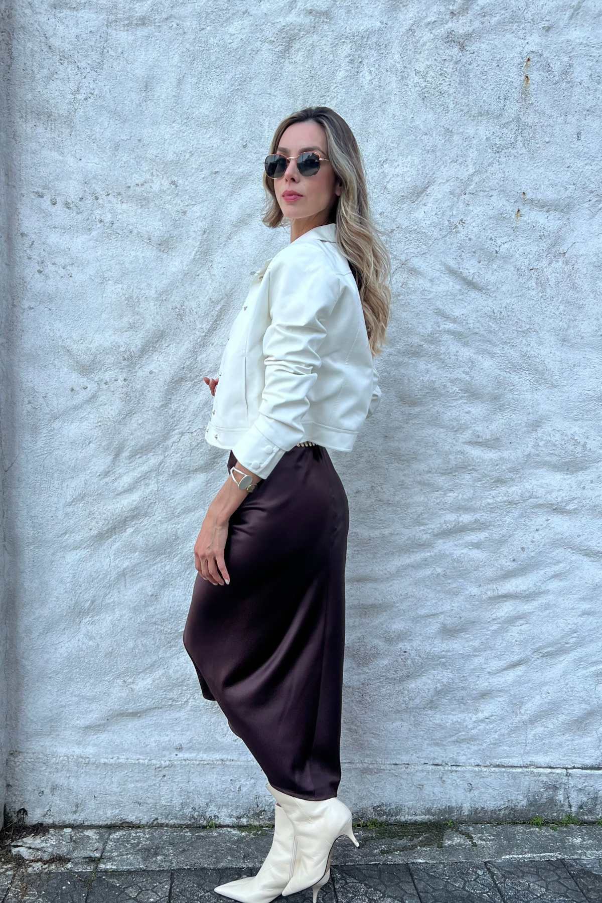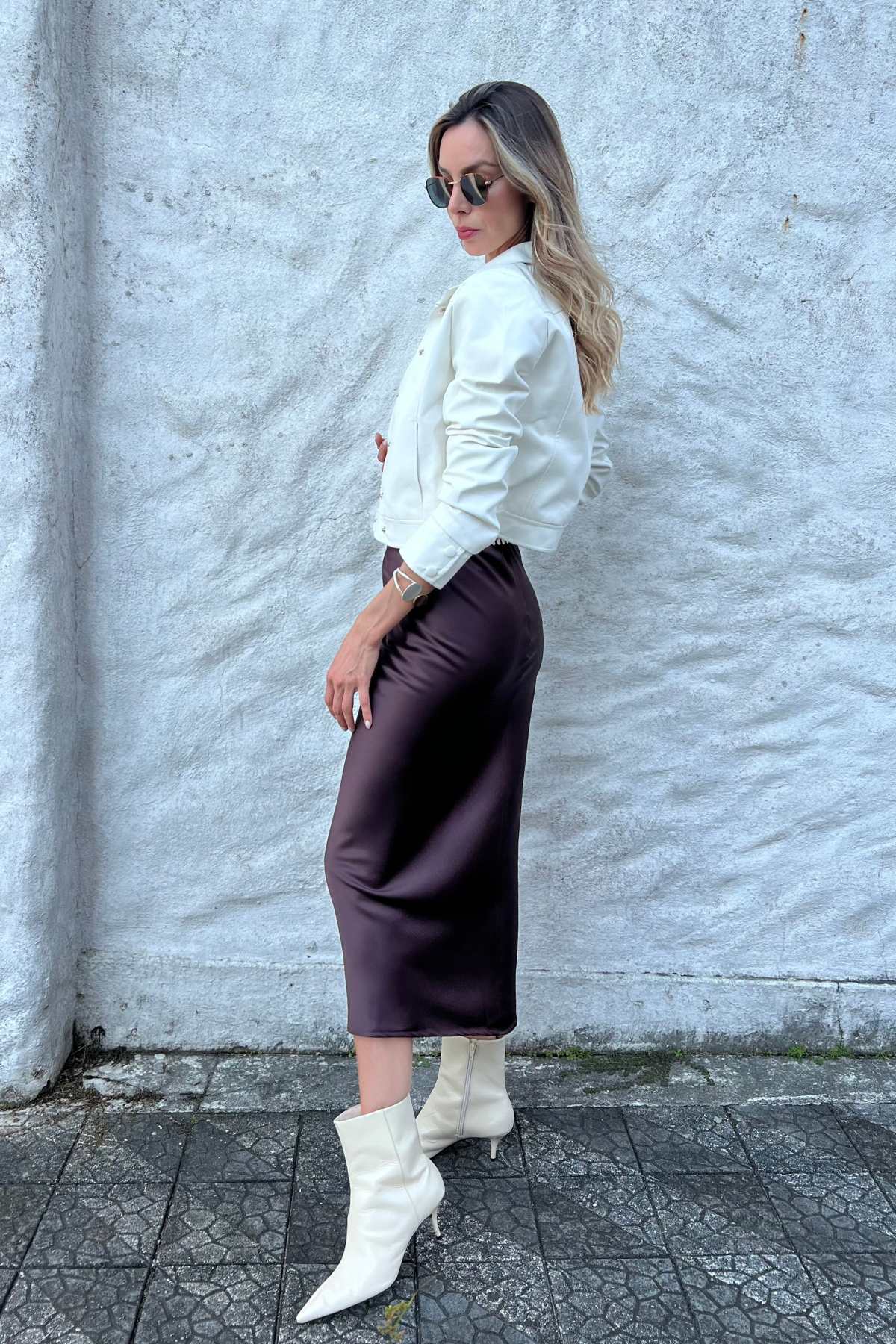 A Saia Midi Acetinada Isis possui corte em viés, elástico no cós, modelagem evasê e um detalhe de recorte no tecido, que traz um toque moderno, elegante e único.