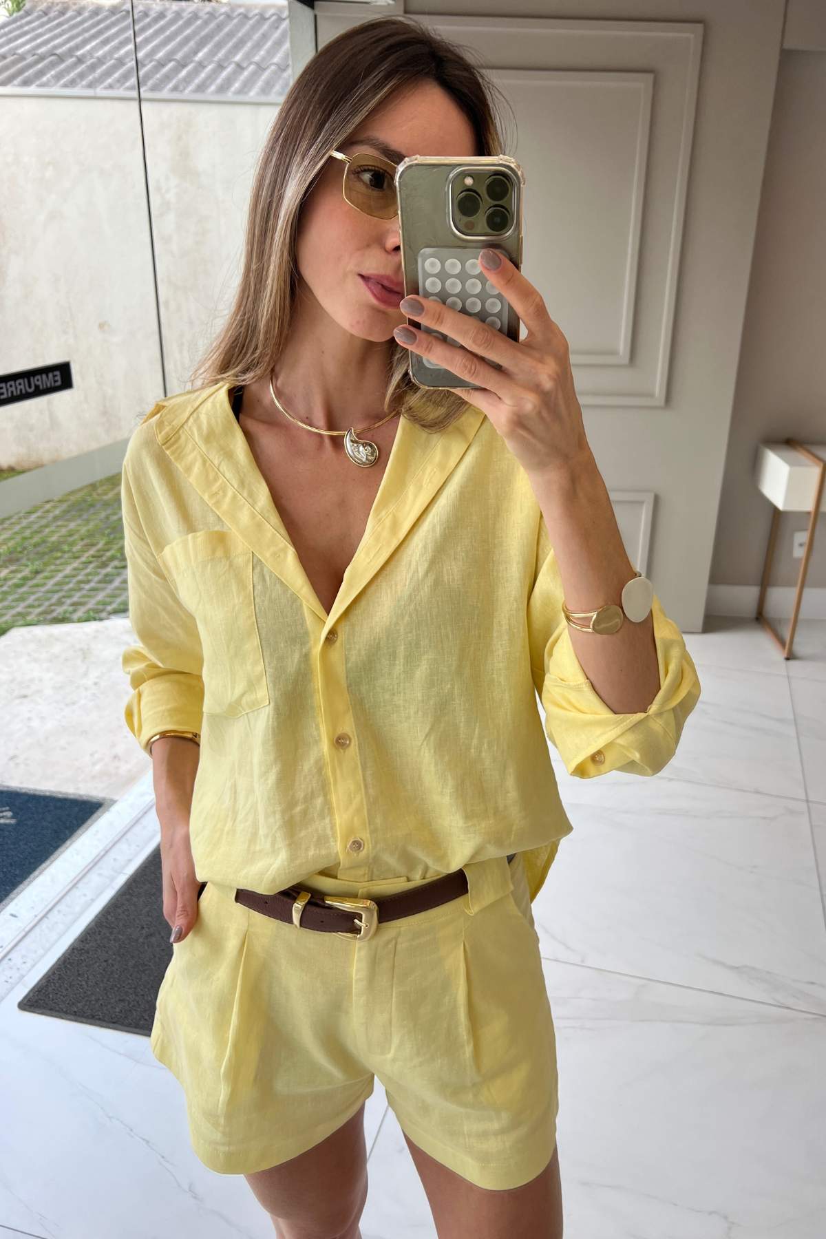 Shorts femininos com corte alfaiataria, detalhes de bolsos laterais e passadores para cinto. Apresenta fechamento frontal com zíper e colchete no cós de altura média.