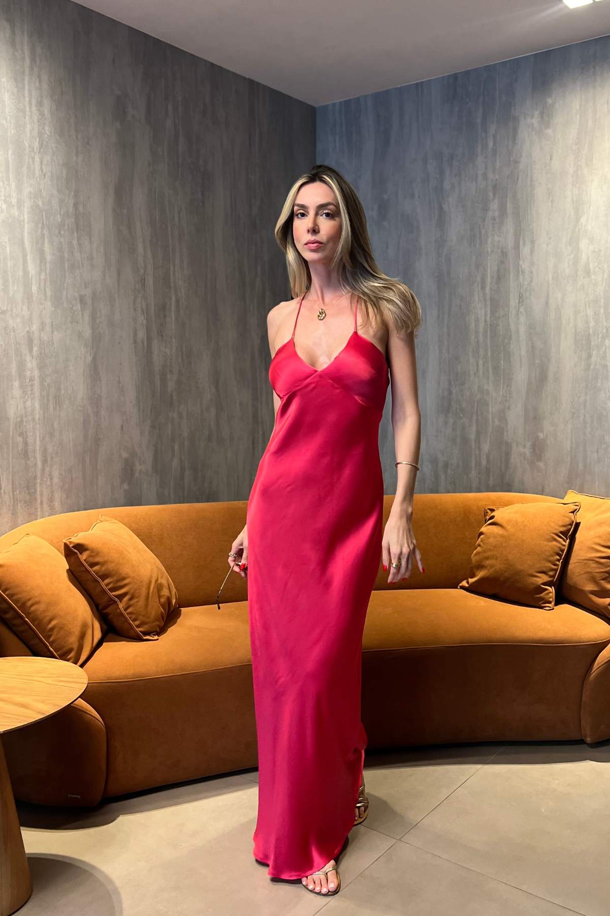 Vestido Longo Acetinado em viscose e decote V, alças finas flexíveis que se ajustam no corpo. Tecido com caimento fluido e toque macio (sensação de conforto e suavidade na pele) . O Vestido Mila tem uma modelagem que valoriza as curvas com naturalidade, trazendo leveza no movimento.